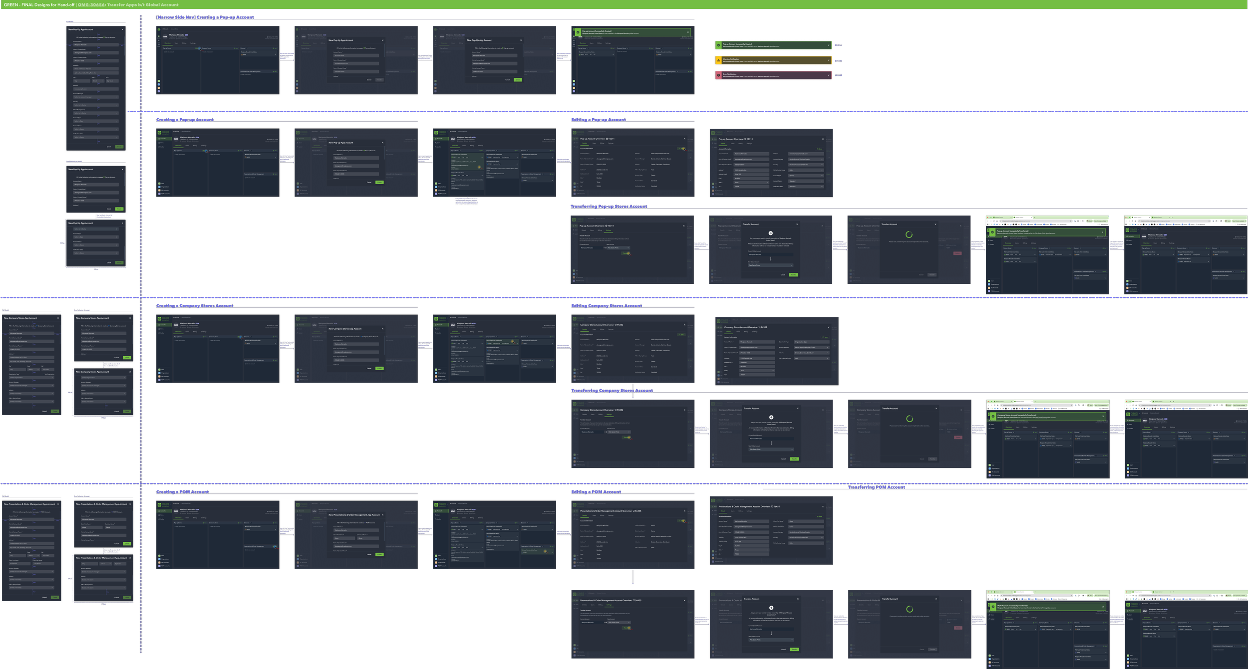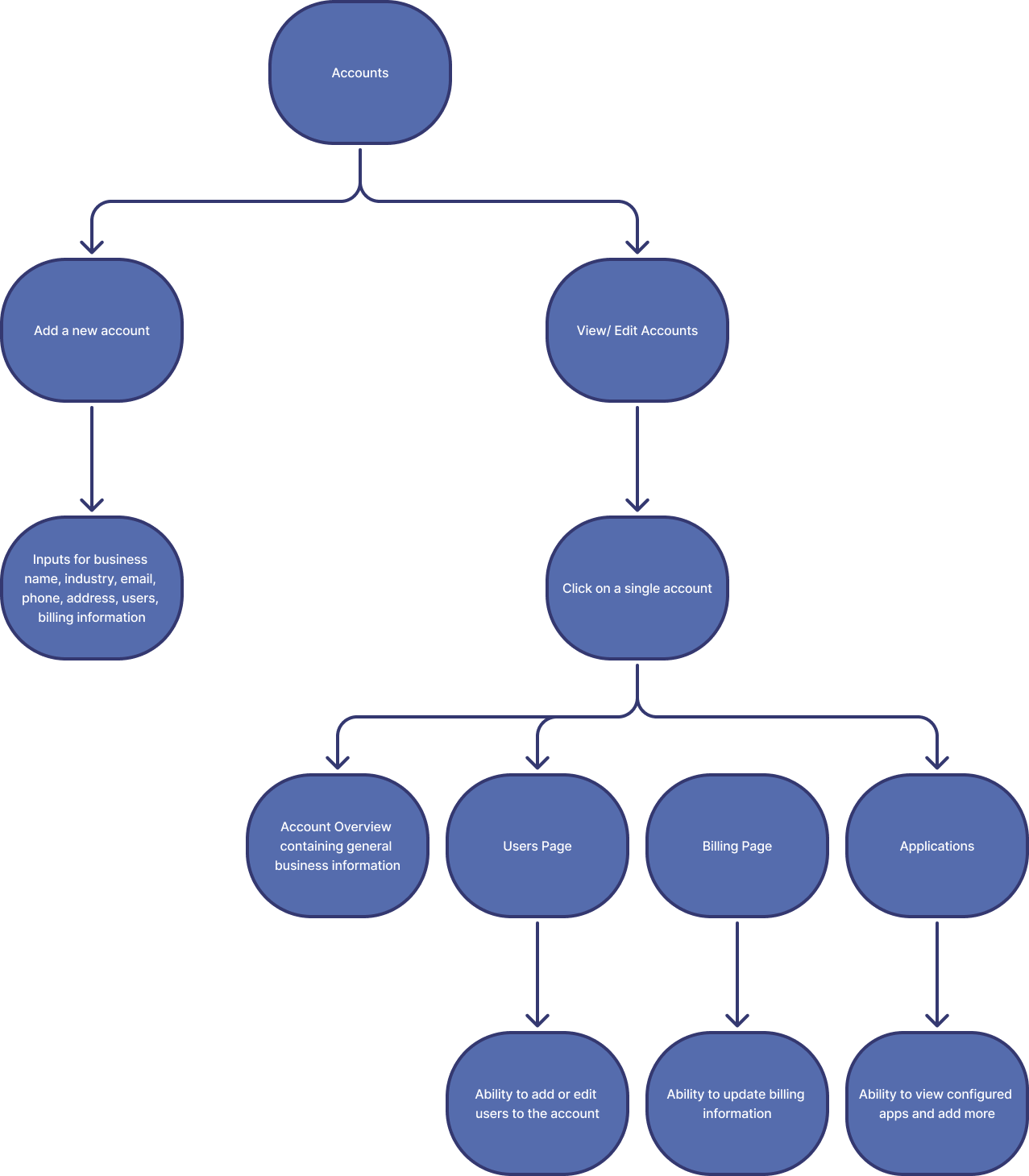 After meeting with our client-facing teams, we understood the key-elements of account set-up and management. I took the information and began to organize the user flows for how our users might navigate to each of these key pieces. I met with the team’s PM and EM to gut-check the user flows and following their confirmation, I began to work on the account service prototype.