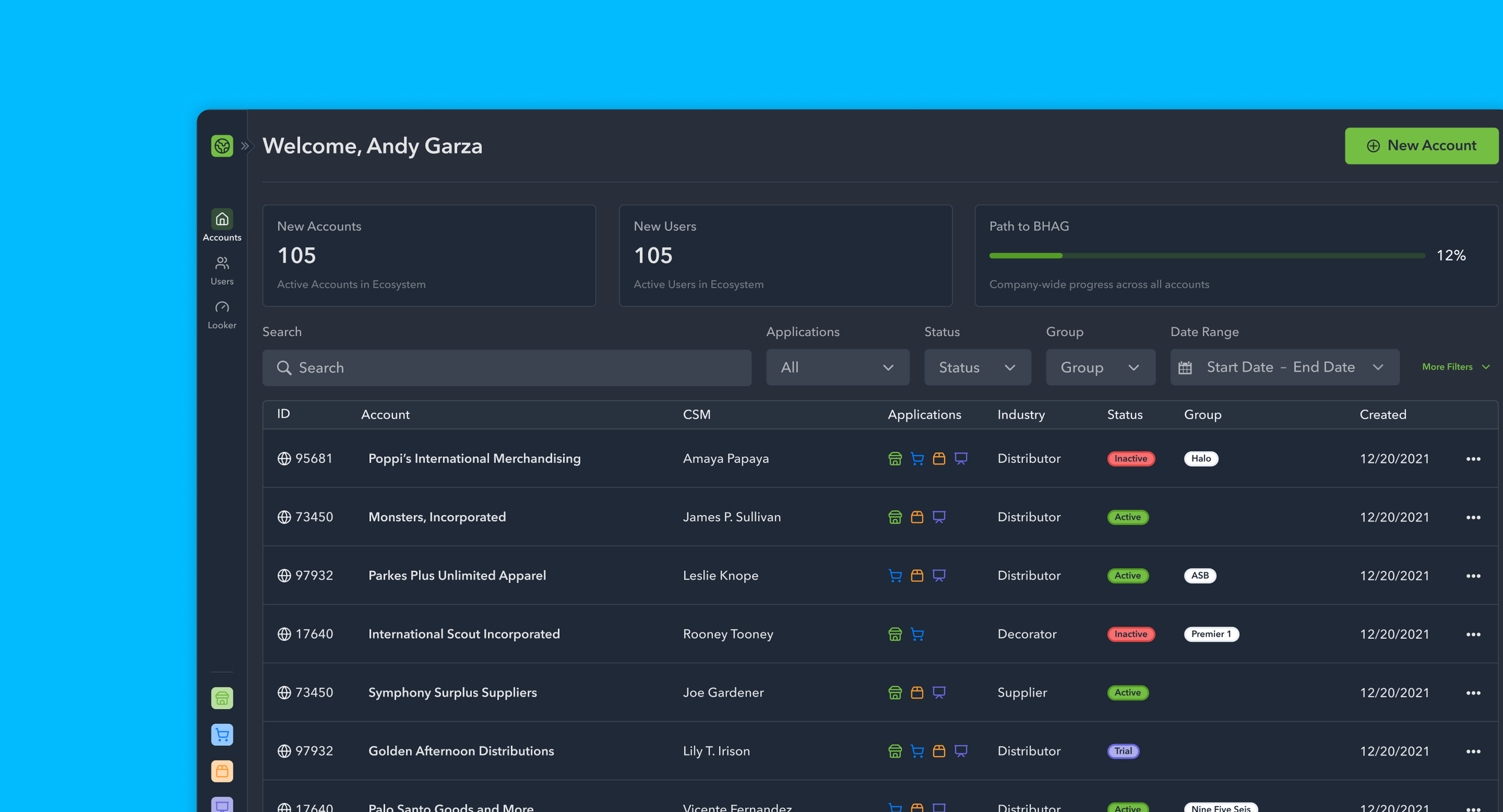 As the OrderMyGear ecosystem grows, we need a single-source of truth that enables our internal users to view all of the accounts in our system. This single entry point will allow internal teams to view, manage and service clients in a manner that is efficient and most all, scalable with the ecosystem.
