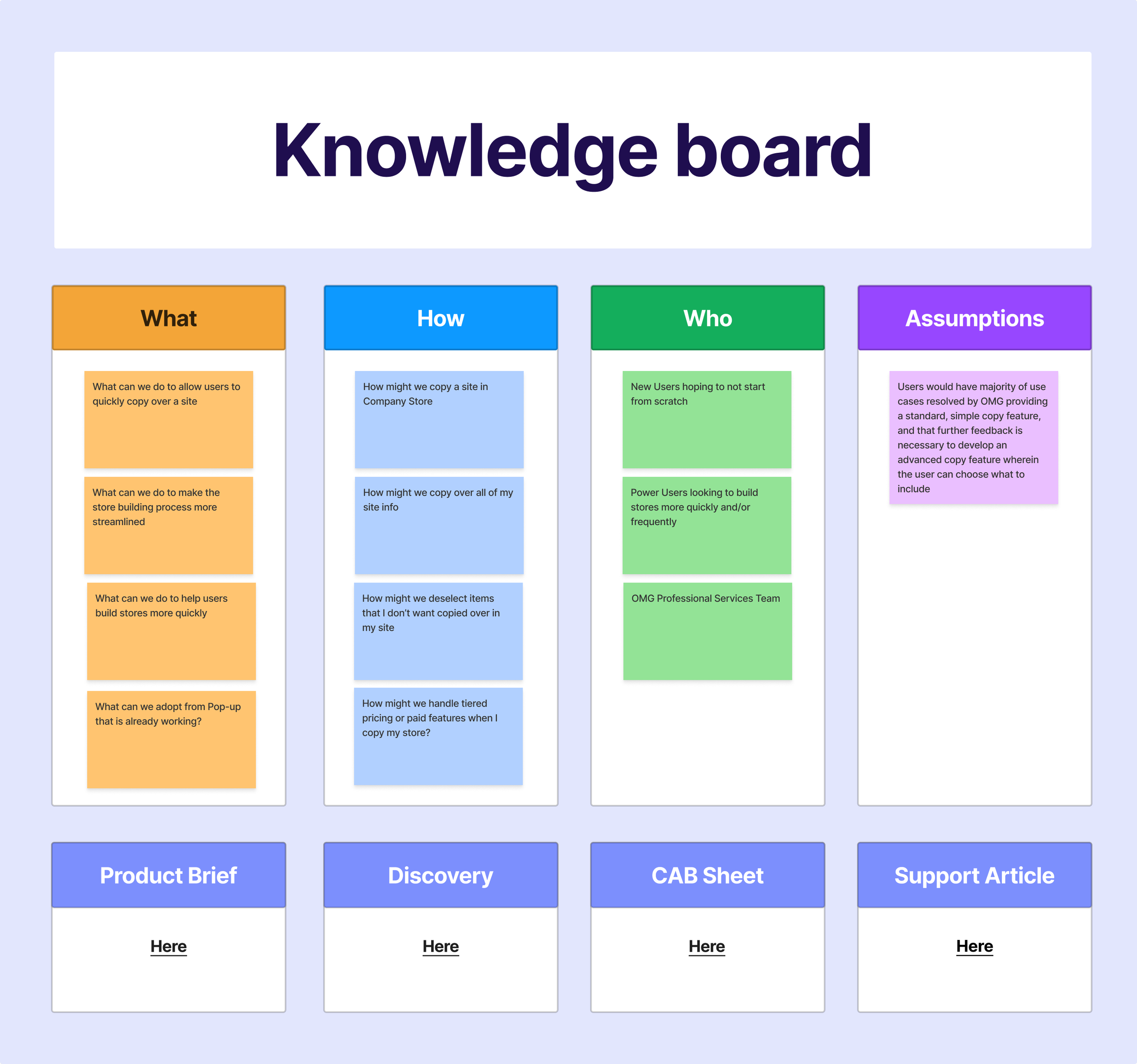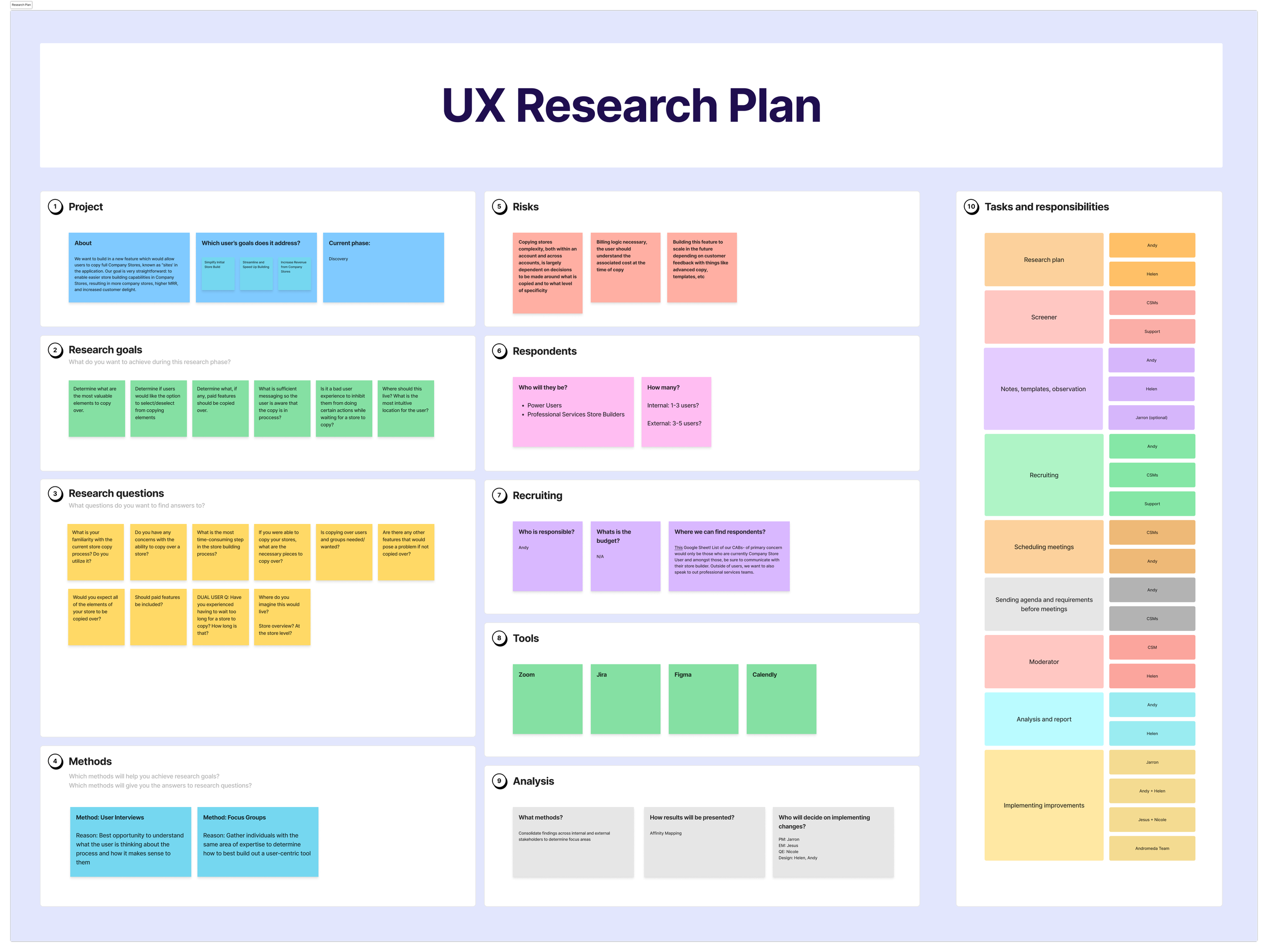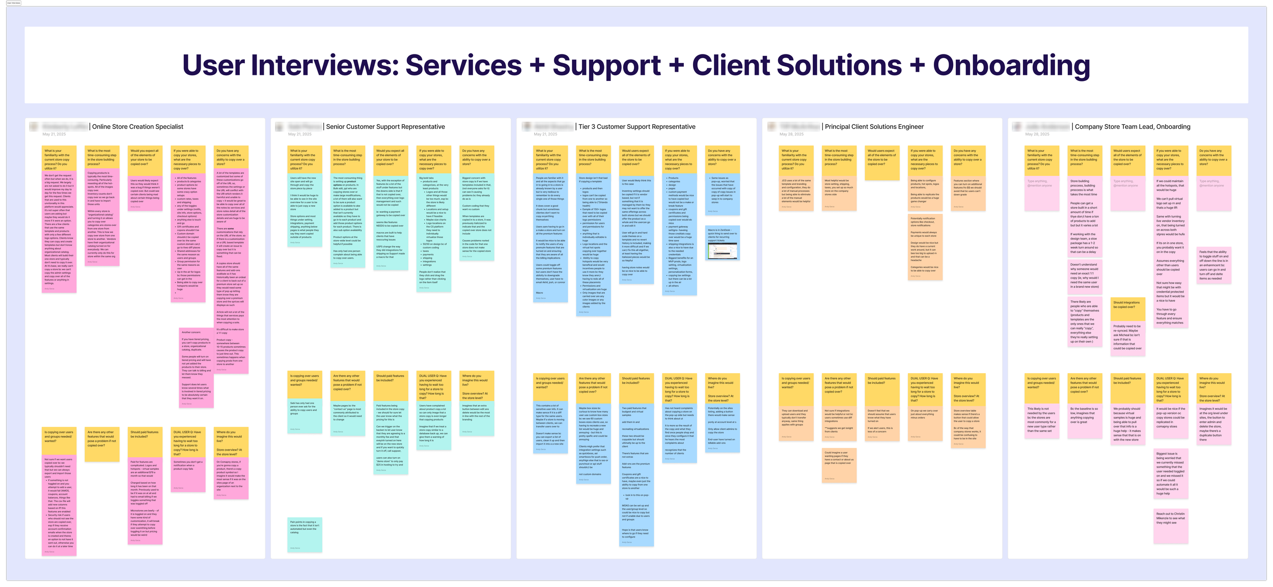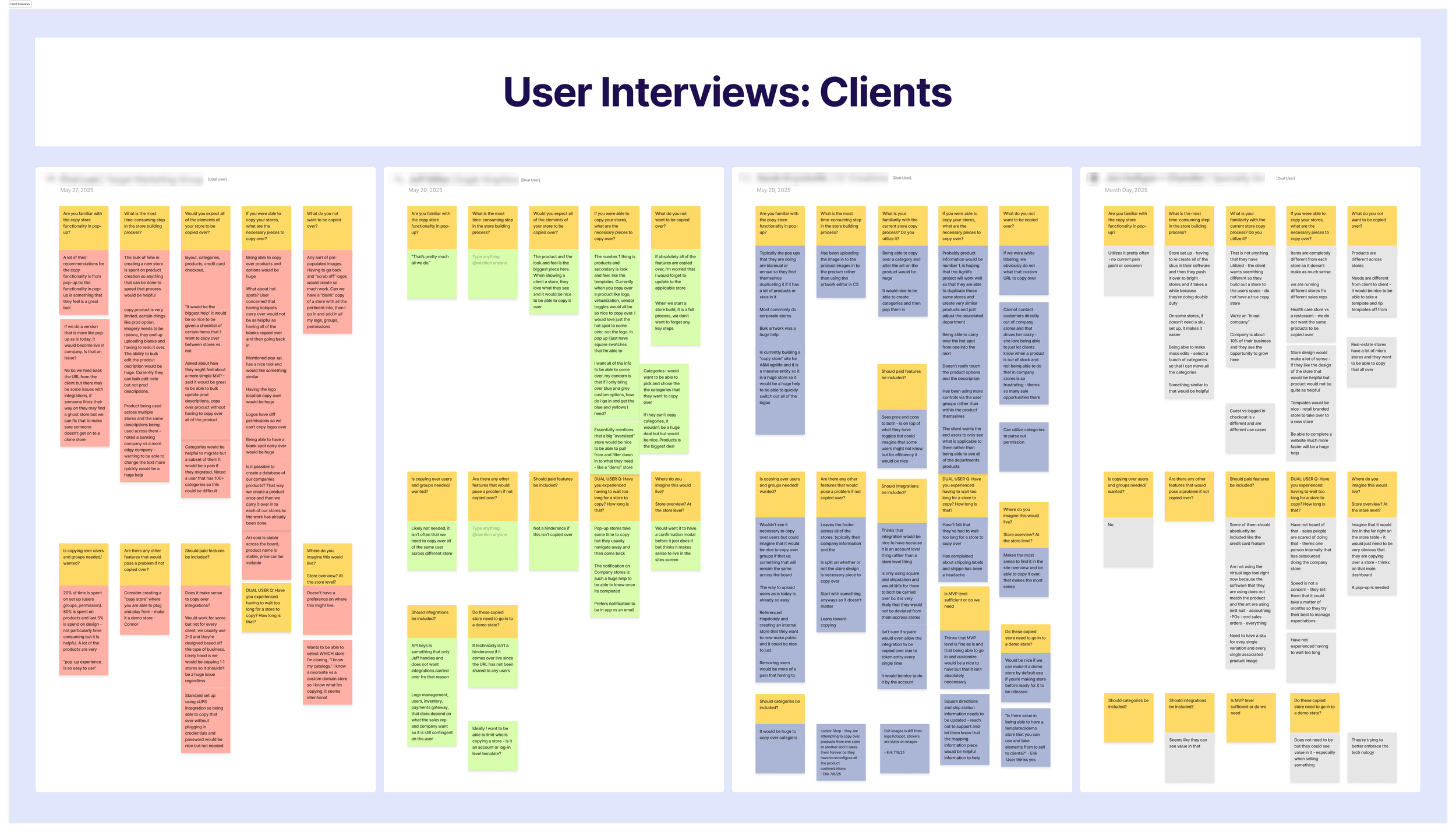 I began the research process by laying out any questions I had regarding the “store copy” functionality so that I was well informed ahead of user interviews. I spent time in the Company Stores application and learned that users were currently able to “copy” their stores, however, it required the employment of our Store Creation Specialist team as it was a complicated process that required engineering-level tech literacy to accomplish. I first began outreach with internal stakeholders to learn the pain points of internal users, as well as hear from them what the most commonly reported user complaints were. During internal stake-holder interviews, I also developed a plan with our Client Success and Support teams to recruit users for interviews.