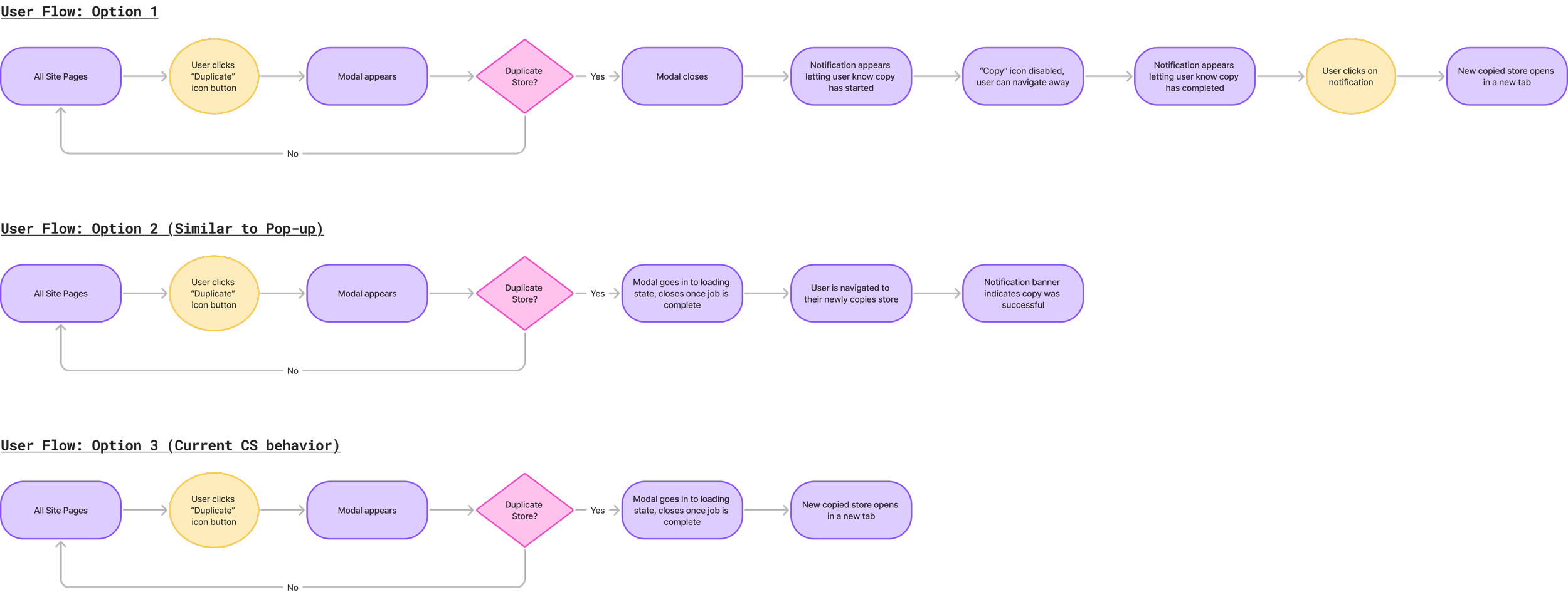 Option 2 allowed users to copy a store, but they would be redirected to a modal that would indicate to the user that the store copy was in progress. They could not navigate away until the store copy was completed. Upon completion, the modal would close and the user would immediately be redirected to their new store. This experience mimicked the Pop-up store copy experience and favored the experience of a dual-account user, however it was disruptive to the user experience as users could not continue to work on other areas of the platform.