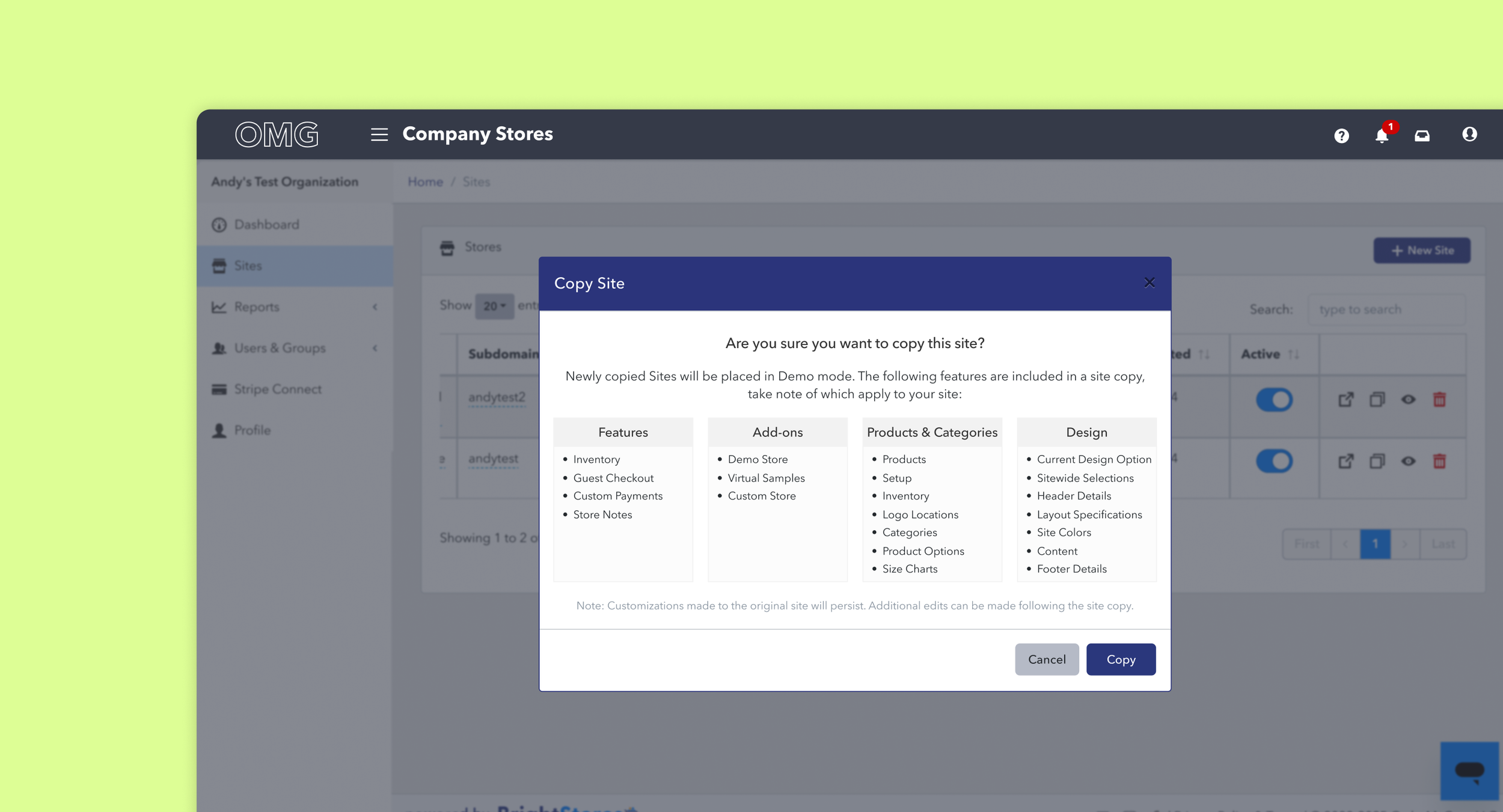 We aimed to build a new feature that would allow users to copy full Company Stores, known as “sites” in the application. Our goal is straightforward: to enable easier store building capabilities in Company Stores, resulting in more company stores, higher monthly recurring revenue, and increased customer delight.