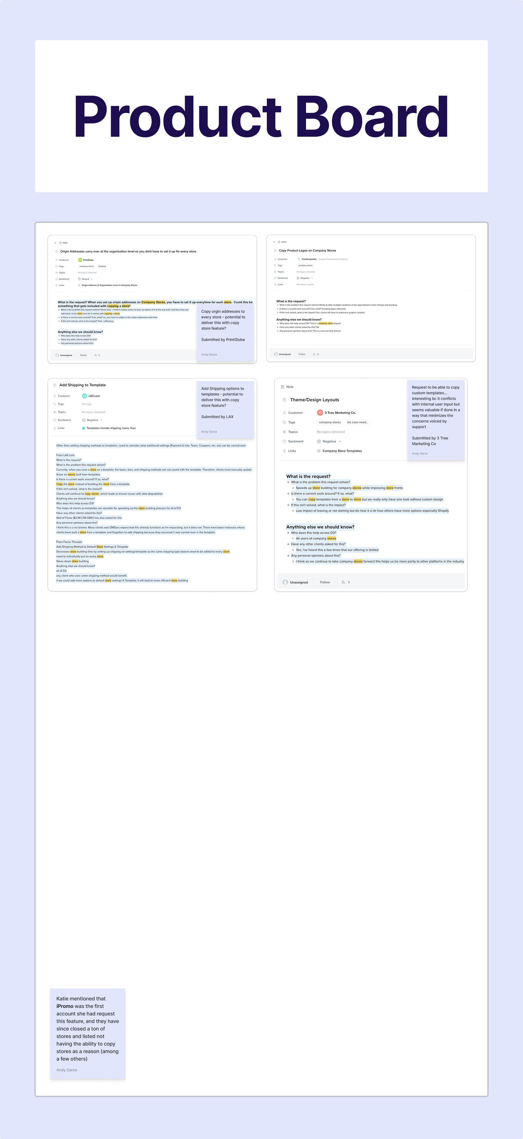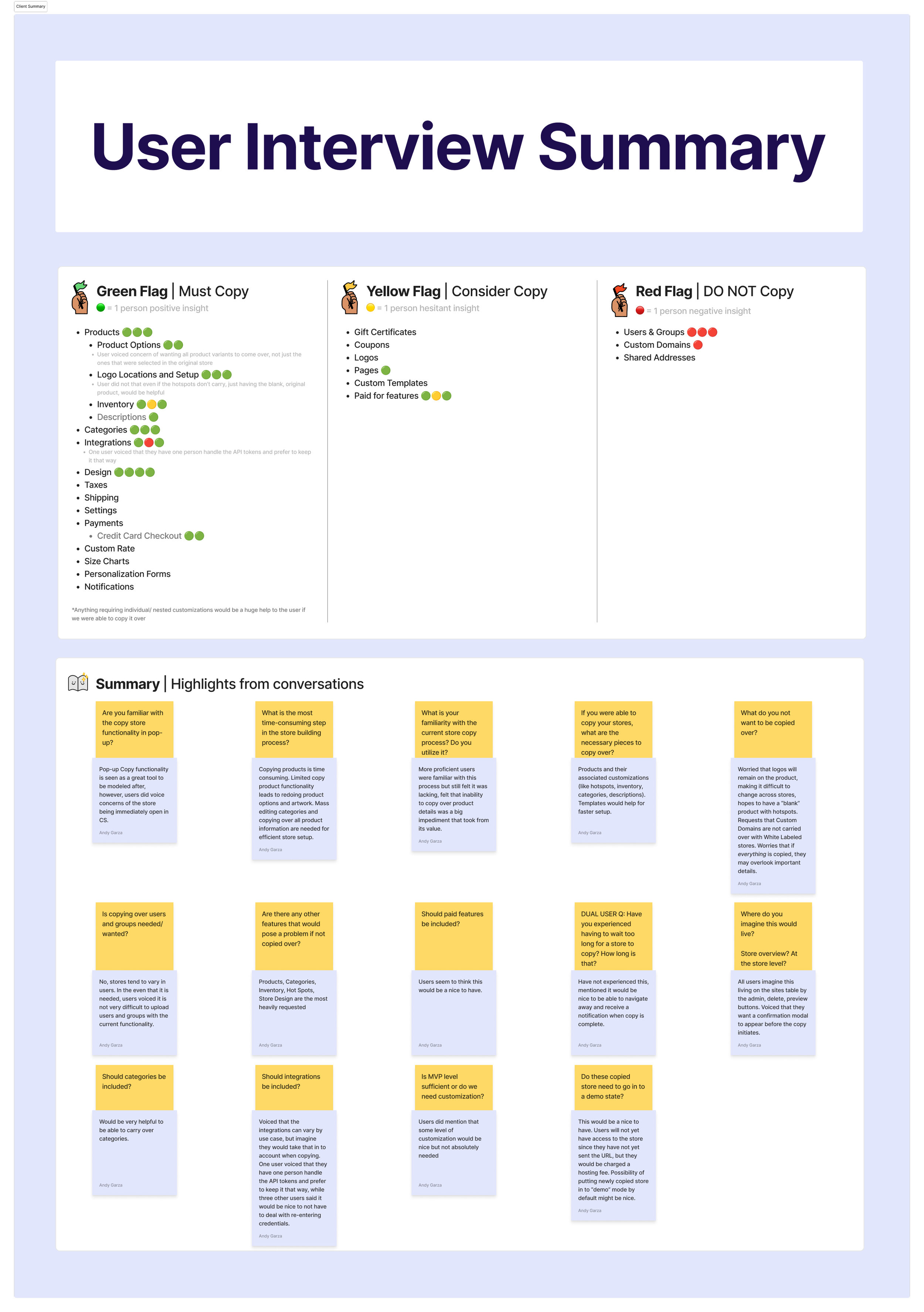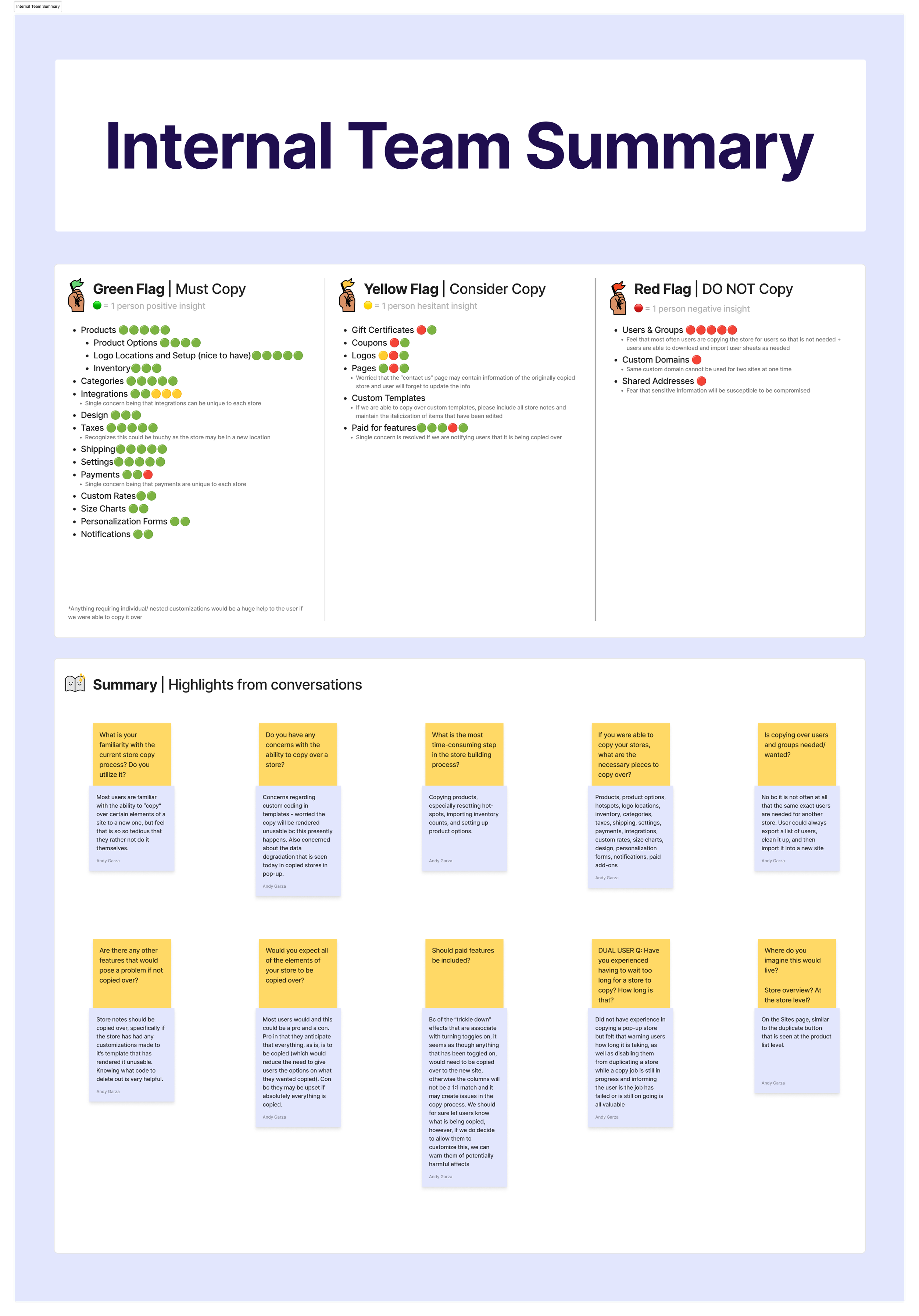 I kicked off internal user interviews by speaking first to a Quality Engineer to better understand the potential technical limitations of a “Copy Store” functionality in Company Stores. Through this, I developed a better understanding of the current process for “copying” a store and learned that it was a large technical burden for our teams to execute. Additionally, I learned about features in Company Stores that, due to security concerns, or technical restrictions, could not be copied over. Following this, I met with members of our Store Creation, Customer Support, and Onboarding teams to hear first hand the issues they most commonly hear from users regarding the most timely, and least intuitive steps of the store build. I consolidated the findings in to a summary and mapped the occurrences of the most requested features to copy, the “maybes“ that should be taken in to consideration, and the “absolute no” features that should not be included. I determined these would be the features I would compare against user requests to analyze where there the most overlap occurred.
