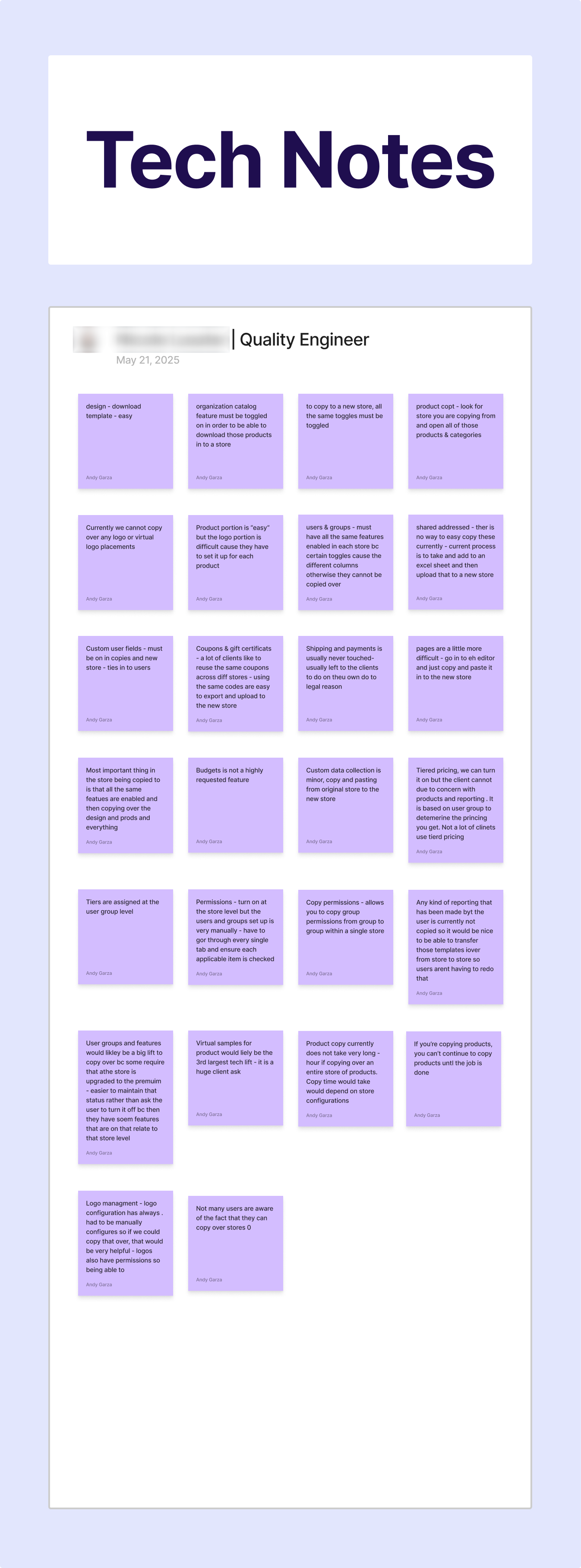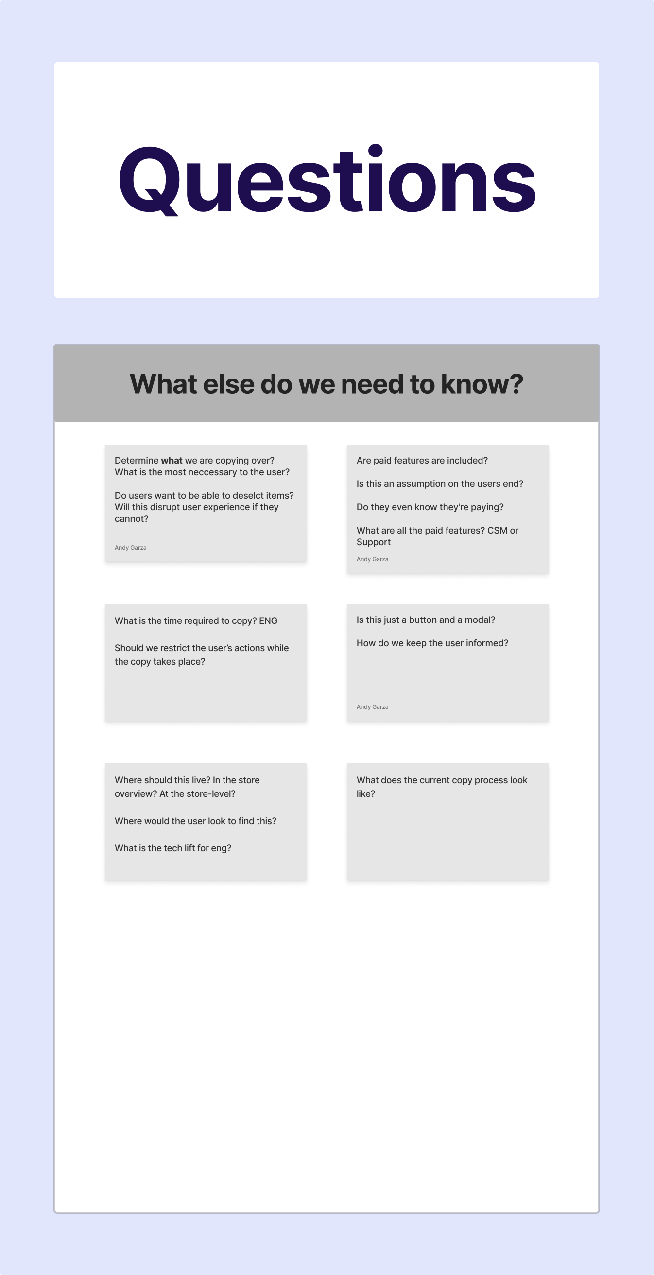To kick off the Store Copy initiative, I first met with my PM to discuss the results of the internal and client interviews, as well as review my proposed design solution. Following that meeting, we met with the team’s QE and EM to ensure there were no technical limitations that had been overlooked. Finally, we met as a team to relay all of the findings and review the design work. Our team’s PM kicked off the meeting by educating the engineers on our users and how heavily requested this feature was. I then led the remainder of the meeting by relaying the information gathered from the user interviews, and how those findings ultimately informed the solution. I provided the engineers with a Confluence document that summed up the research findings, as well as Figma that was annotated for their review.