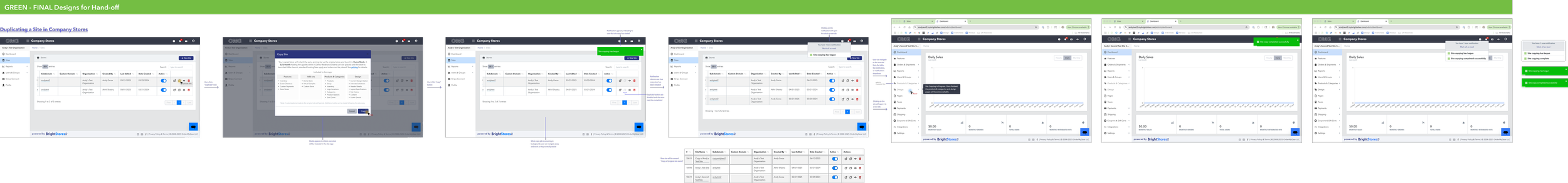 During user interviews, we asked users where they might imagine they would navigate to copy their store. The resounding response from both internal users and clients, was the “Sites table”. On the Sites page, users already had icon buttons that allowed them to manage admin permissions, delete their site, and preview their site. Naturally, users felt that the ability to copy their site would be nestled amongst these features. We moved forward with this location since it leveraged a behavior known to users. Another repeated concern from users was ensuring that they would be warned before a store copy was initiated and transparency regarding any costs they would be incurring. We determined that upon copy, users would see a modal that details exactly what is being copied over from their original store, as well as the pricing details. Additionally, to protect against rage-clicking or overwhelming the system, we disabled the “copy store” icon button for all sites until the site copy was completed. Finally, to ensure users could begin working on their newly copied store as quickly as possible, we made the site available upon partial completion- this meant users could edit other areas of their site, excluding the “Products & Categories” and “Design” Pages. These two pages were most often the bulkiest area to copy, so this reduced the perceived amount of time users were waiting for a store copy to complete. When the store copy was fully completed, users would receive a notification that would alert them as such, and upon clicking the notification, the new site would open in a new tab so that users would not lose any work they may currently be working on.